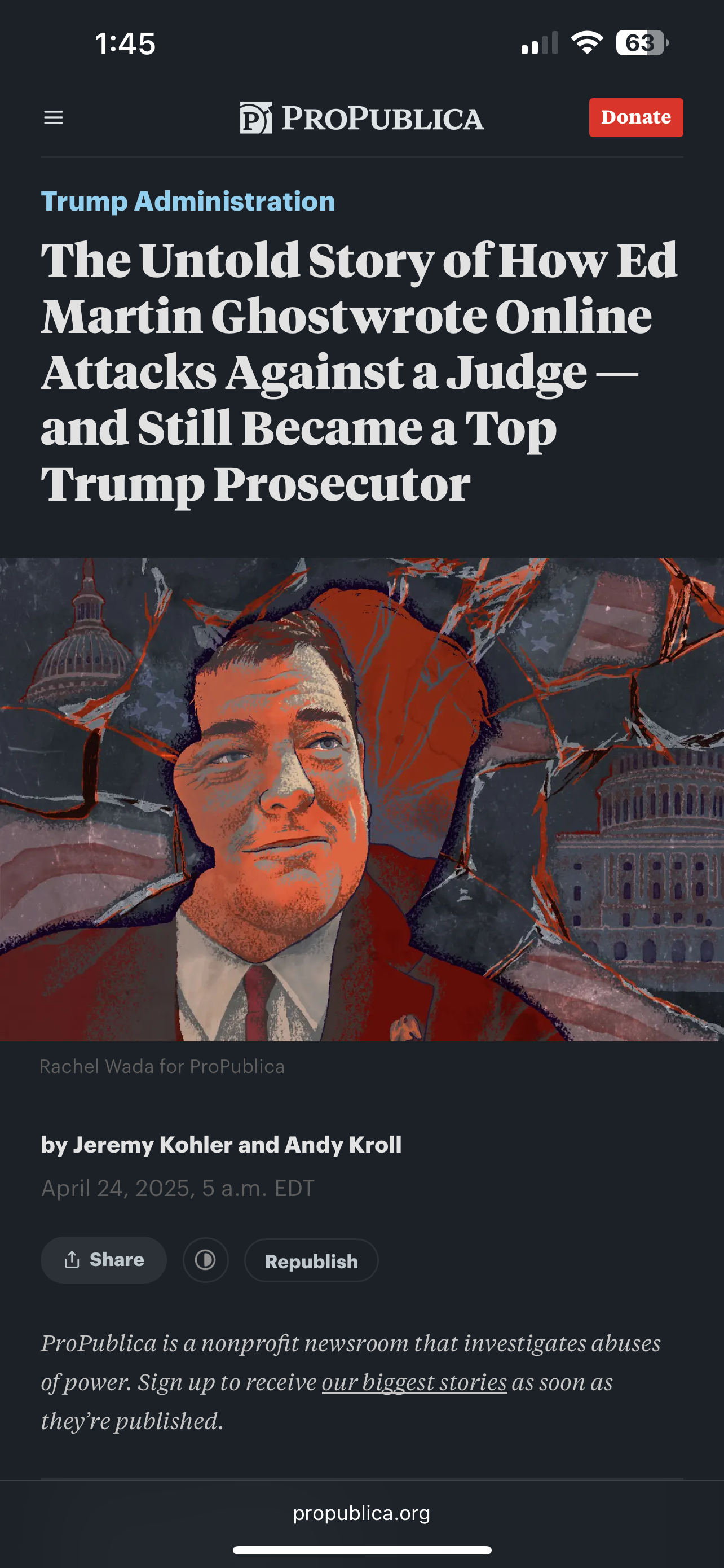 Lead illustration accompanying the article “The Untold Story of How Ed Martin Ghostwrote Online Attacks Against a Judge — and Still Became a Top Trump Prosecutor” by Jeremy Kohler and Andy Kroll. 2025.